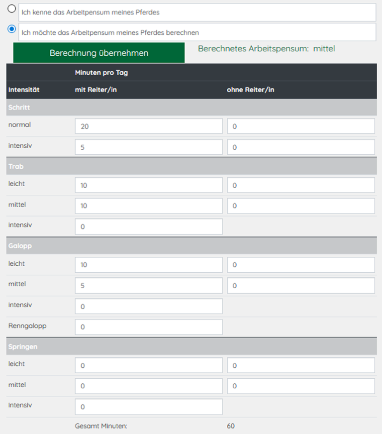 Wenn du nun ganz genau wis­sen willst, wie viel dein Pferd arbei­tet, gibst du sein täg­li­ches Pensum ein­fach in unser neu­es Menü ein.