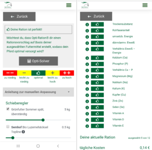 Du hast unser Testpferd fer­tig ein­ge­ge­ben? Dann kannst du nun 24 h lang Rationen für das Pferd berech­nen, ana­ly­sie­ren und opti­mie­ren lassen.
