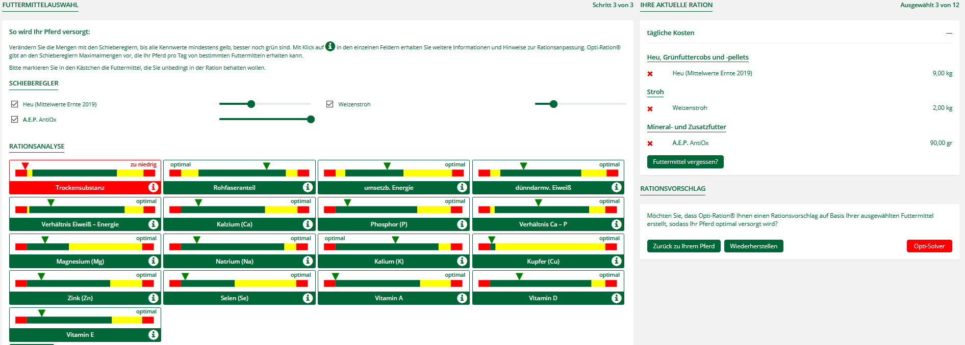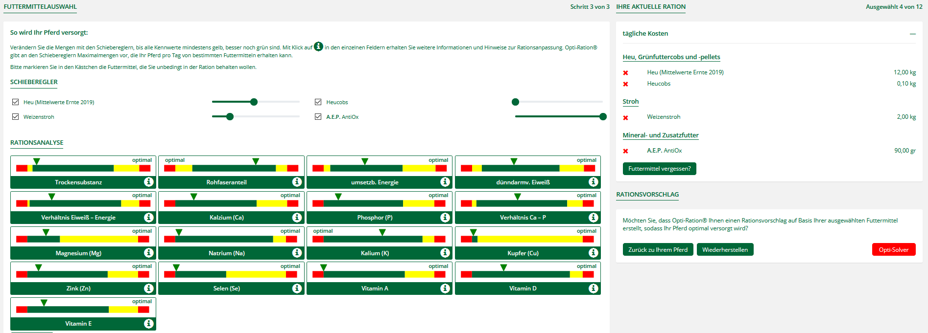 Der Wert, den OPTI-RATION® als SOLL-Wert für ein übergewichtiges Pferd angibt, berücksichtigt bereits die Abzüge an Energie. Hier sollte die Ration in den grünen Bereich gebracht werden. Eine Unterversorgung von Energie wäre fatal, schließlich soll das Pferd auf Diät, nicht verhungern…