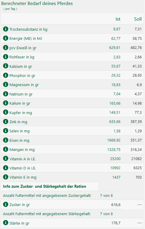 In der Ration wurde der Eiweißbedarf mit Kartoffeleiweiß gedeckt. Mehr zu diesem – in der Pferdefütterung – noch recht neuen Einzelfutter gibt es HIER. Der hohe Kalziumanteil durch die Luzernecobs wurde durch Zugabe der phosphorreichen Reiskleie ausgeglichen. Die Ration hat nun unter 180 gr Stärke, der Zuckeranteil kommt weitestgehend aus dem Heu.