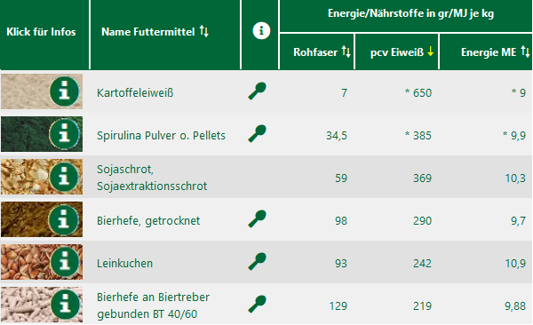 In der Datenbank von Opti-Ration lassen sich die Futtermittel nach dem Gehalt an praecaecal verdaulichem Eiweiß sortieren. Folgende Einzelfuttermittel haben besonders hohe Gehalte: