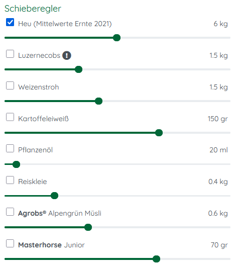 Bei vorhandenen Allergien legst du selbst (möglichst in Absprache mit deinem Tierarzt) die geeigneten Futtermittel für die Ration fest. So können auch Pferde mit besonderen Ansprüchen mit der optimalen Ration versorgt werden.